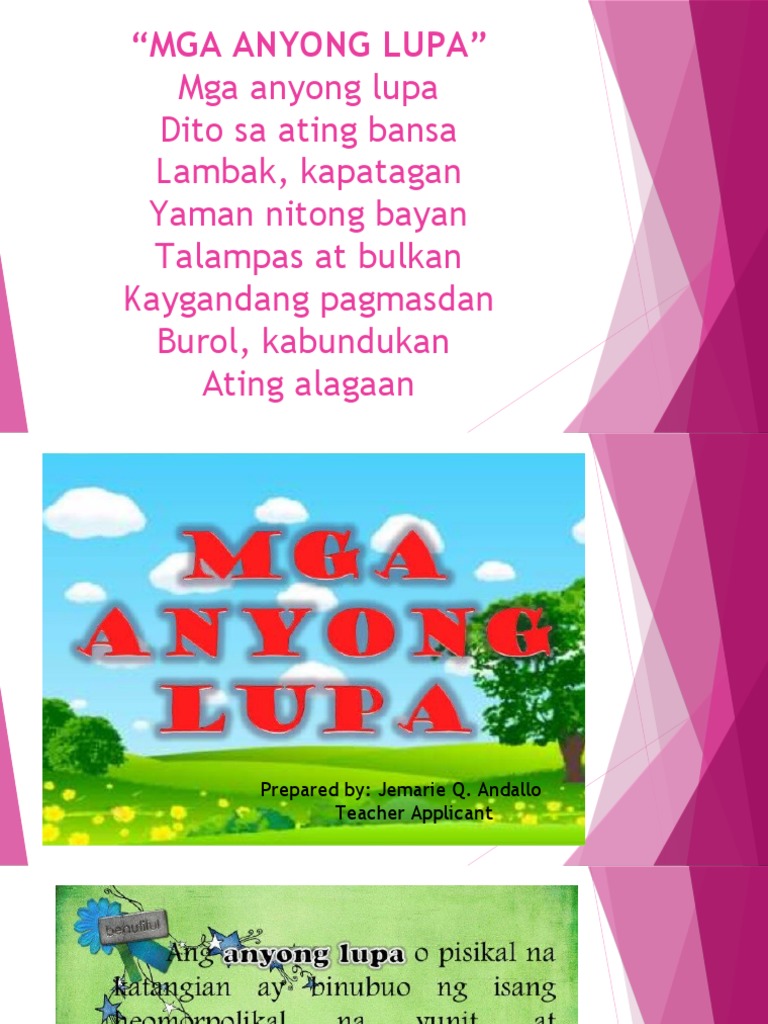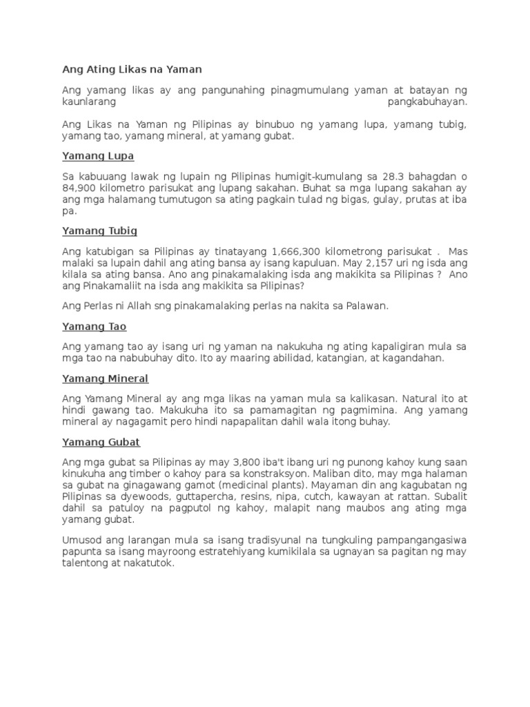 Ang mga likas yaman ay ang mga batayan ng kaunlarang pangkabuhayan ng isang bansa sapagkat dito sila kumukuha ng maraming yamang ginagamit sa ibat ibang hanapbuhay at paglikha ng produkto. ANYONG LUPA Narito ang ibat ibang uri ng mga Anyong Lupa kabilang na ang Kapatagan Bundok Bulubundukin Bulkan Burol Lambak Talampas at Tangway. Ito ay hindi gawa ng tao ngunit gawa ng Panginoon.