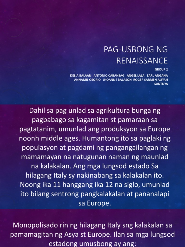 Anyo at paraan ng pagtuturing sa sining na ginamit sa nasabing panahon. Batay sa mga impormasyong inilahad bakit nga ba sa Italy sumibol ang Renaissance. GROUP 4 Mga ambag ng renaissance sa.