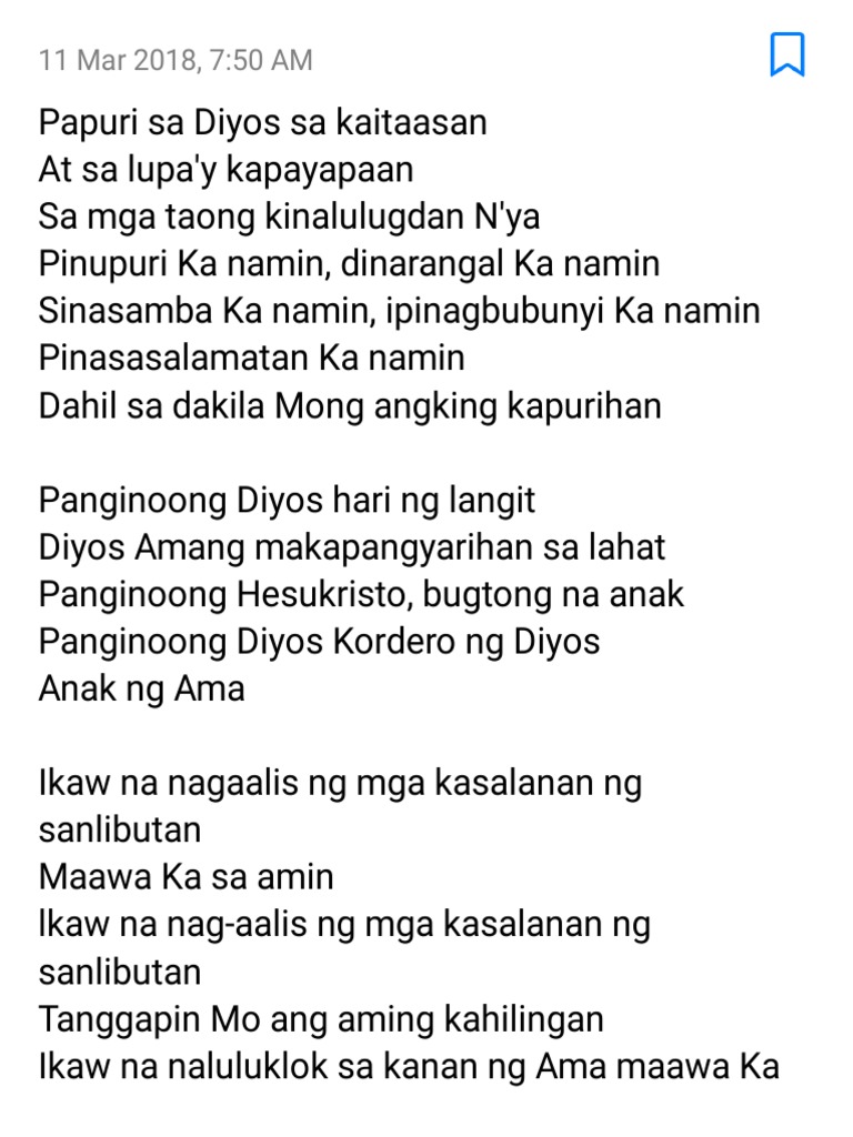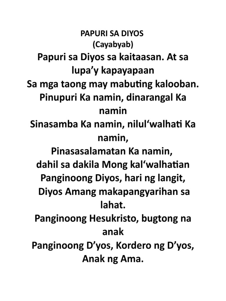 At sa lupay kapayapaan Sa mga taong kinalulugdan Niya Pinupuri Ka namin dinarangal Ka namin Sinasamba Ka namin ipinagbubunyi Ka namin KORO Pinasasalamatan Ka namin Sa Yong dakilang angking kapurihan Panginoong Diyos Hari ng langit Diyos Amang makapangyarihan sa lahat Panginoong Hesukristo Bugtong na Anak Panginoong Diyos Kordero ng Diyos.