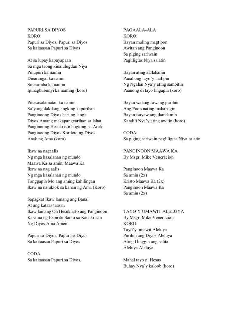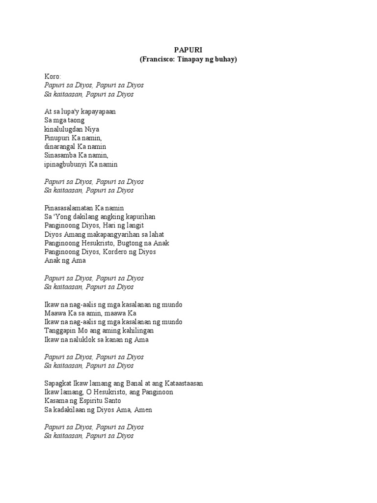 Papuri sa Diyos Lyrics. Papuri sa Diyos Papuri sa Diyos Papuri sa Diyos sa kaitaasan At sa. G c am g d g d7 g c d7 g papuri sa diyos papuri sa diyos g c am g d7 g papuri sa diyos sa ka-i-ta- a- san d7 g at sa lupay kapayapaan d7 g at sa lupay kapayapaan c e am g d7 g sa mga taong kinalulugdan niya d7 g d7 g pinupuri ka namin dinarangal ka namin b7 em d a7 d sinasamba ka namin ipinagbubunyi ka na- min g g7 c a7 d pinasasalamatan ka na.
