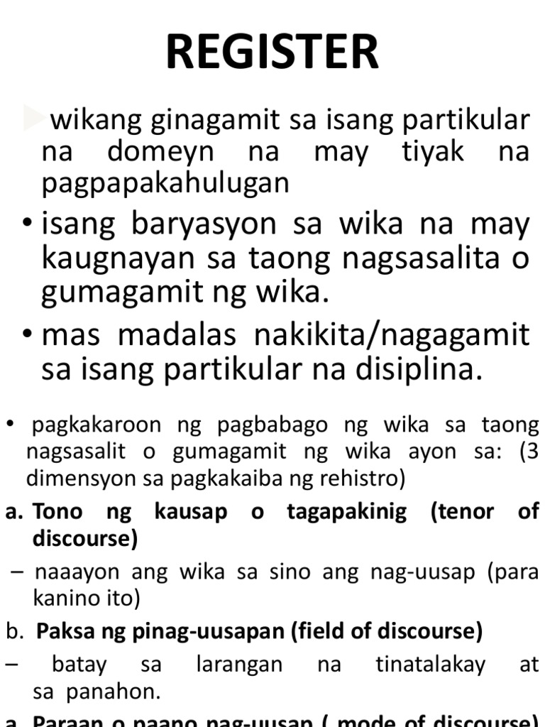 Register ng wika halimbawa. Kung sino ang kausap o tagapakinig tenor of discourse anong paksa ang pinag- uusapan field of discourse at paraan o paano nag-uusap mode of discourse. Nasasabi kung ano ang register bilang varayti ng wika. Ang wika ng mga bakla.