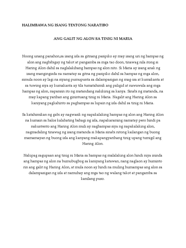 Pagdating naming sa simbahan ay doon kami. Unfortunately one Halimbawa Ng Tekstong Narativ Essay cant deny the necessity of doing homework as it may influence students grades greatly. Halimbawa ng tektsong naratibo Nobela Isang naimbento na salaysay ng prosa ng malaki ang haba at isang tiyak na pagiging kumplikado na nakikitungo sa kaisipang may karanasan sa tao karaniwang sa pamamagitan ng isang konektadong pagkakasunud-sunod ng mga kaganapan na kinasasangkutan ng isang grupo ng mga tao sa isang tiyak na tagpuan.