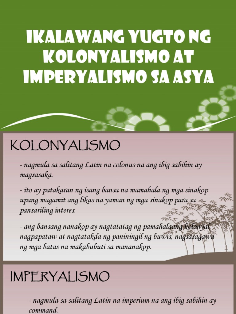 IMPERYALISMO AT KOLONYALISMO Sa paksang ito ating pag-aaralan kung ano nga ba ang pagkakaiba ng kolonyalismo at imperyalismo at ang mga halimbawa nito.