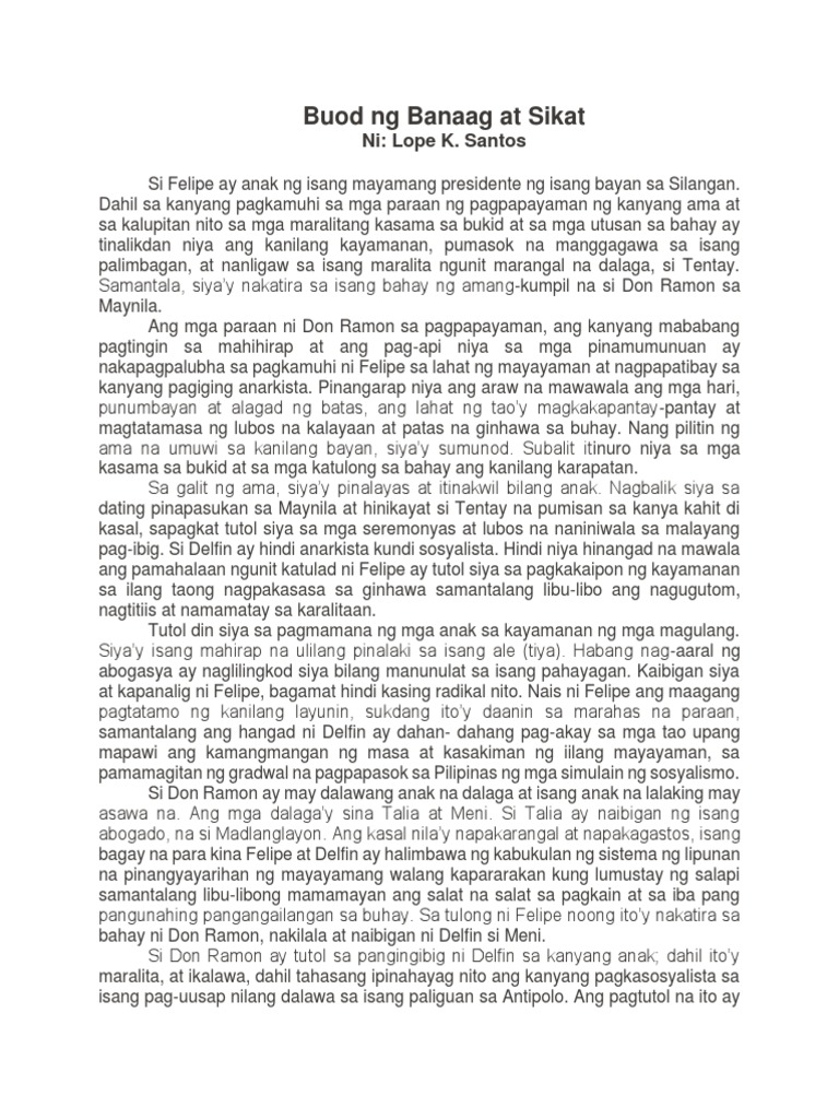 Banaag At Sikat Buong Kwento Halimbawa 1 Halimbawa 3 Isang obra maestro ng manunulat at tanggol ng wika na si Lope K. Mga hayág nádadamá pag-iisip pangdamdám kalooban at mga matá taynga at kamáy. Banaag at Sikat kuha ni Beth Añonuevo Umiinog ang nobela sa buhay nina Delfin at Felipe na kapuwa nagtataglay ng sungayang ideolohiyang may kaugnayan sa sosyalismo.
